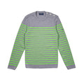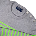 Saint James wool striped sweater with silver anchor detailed button on one shoulder.