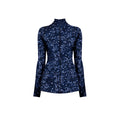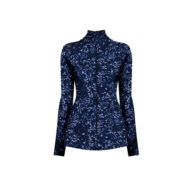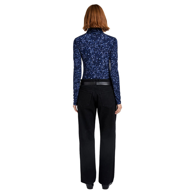 The Audrey Top in Printed Jersey features a slim long-sleeve turtleneck adorned with an all-over abstract motif.