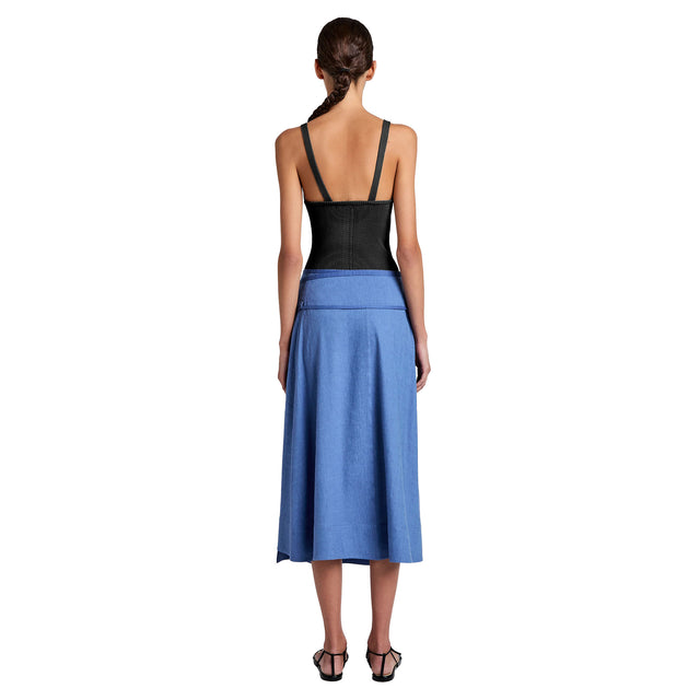 The Jovie Wrap Skirt in Linen Slub is crafted to an A-line silhouette. Wrapped at the side waist, it is finished with a small button fastening and double self-ties.