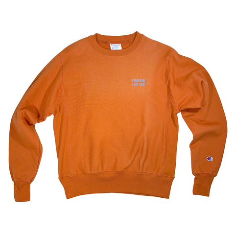 Lewisburg Surf Shop embroidered vintage Champion crewneck sweatshirt in burnt orange with blue LSS logo embroidery.