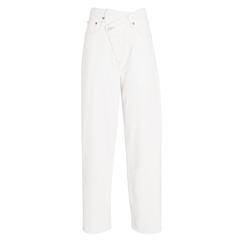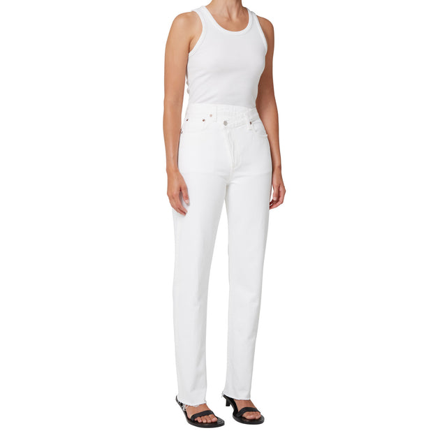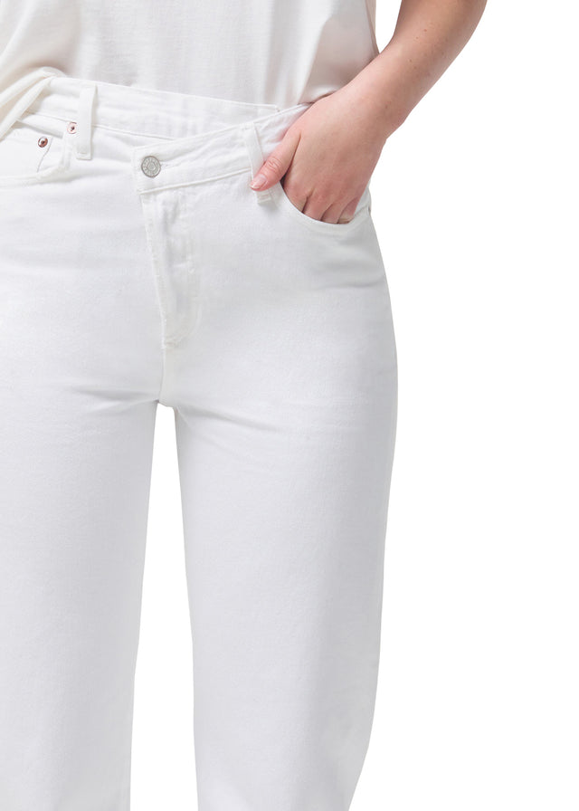 An update to Agolde's best-selling criss cross fit. This true straight silhouette is cut with a high rise, offset back waistband and criss cross button-front detail. True to size and worn high on the waist.
