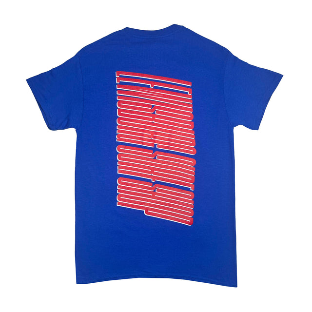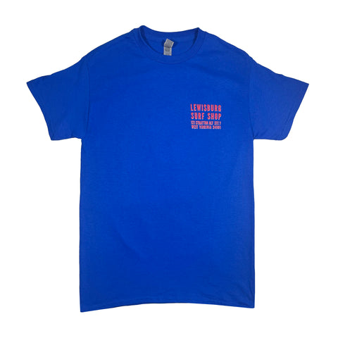 Lewisburg Surf Shop Blue T-Shirt with small red and white logo on front, and large red and white slant LSS logo on back.