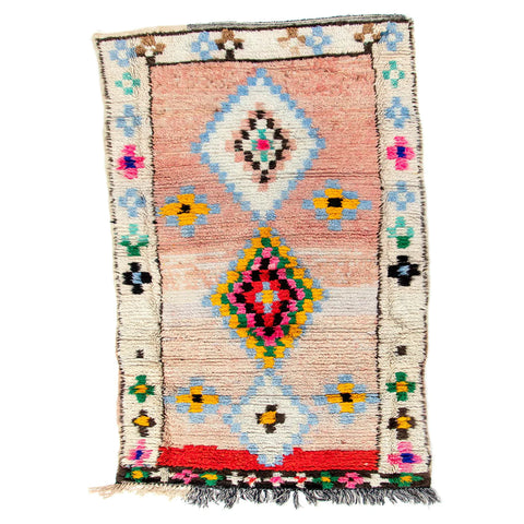 de Maroc's Multi Diamond features a stunningly artistic design indicative of the skill that went into weaving it. Bold, bright colors make this a stand-out piece. The perfect size for a small space or layering with other rugs. This rug was hand-knotted by members of the Boujaad tribe.