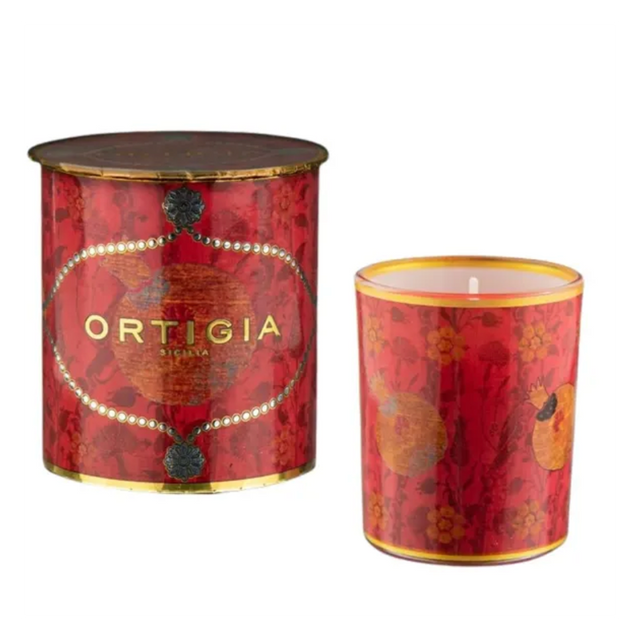 A decorated glass candle jar of wax infused with the crisp dry pomegranate perfume.